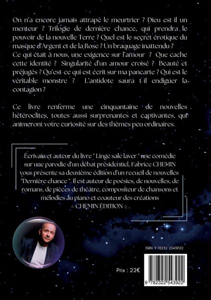 On n'a encore jamais attrapé le meurtrier ? Dieu est-il un menteur ? Trilogie de Dernière Chance, qui prendra le pouvoir sur la nouvelle Terre ? Quel est le secret érotique du masque d'argent et de la rose ? Un braquage inattendu ? Ce qui était à nous, une nouvelle exigence sur l'amour ? Que cache cette identité ? Singularité d'un amour croisé, beauté et préjugé, qu'est-ce qui écrit sur ma pancarte ? Un antidote pour endiguer une contagion, qui est le véritable monstre ? Ce livre renferme une cinquantaine de nouvelles hétéroclites, toutes aussi surprenantes que captivantes, qui animeront votre curiosité sur des thèmes peu ordinaires.