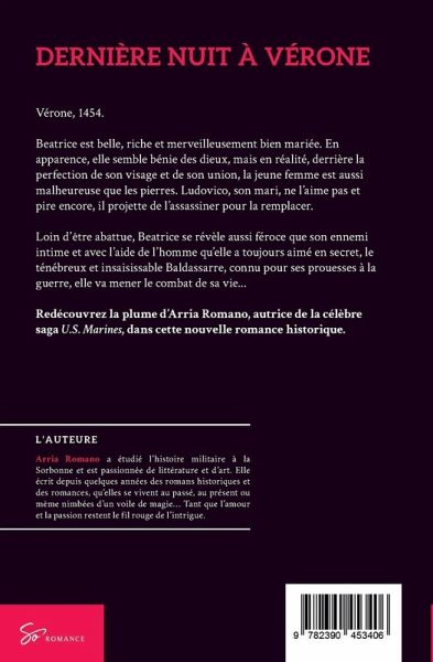Vérone, 1454. Beatrice est belle, riche et merveilleusement bien mariée. En apparence, elle semble bénie des dieux, mais en réalité, derrière la perfection de son visage et de son union, la jeune femme est aussi malheureuse que les pierres. Ludovico, son mari, ne l'aime pas et pire encore, il projette de l'assassiner pour la remplacer. Loin d'être abattue, Beatrice se révèle aussi féroce que son ennemi intime et avec l'aide de l'homme qu'elle a toujours aimé en secret, le ténébreux et insaisissable Baldassarre, connu pour ses prouesses à la guerre, elle va mener le combat de sa vie... Redécouvrez la plume d¿Arria Romano, autrice de la célèbre saga U.S. Marines, dans cette nouvelle romance historique. À PROPOS DE L'AUTEURE Arria Romano étudie l¿histoire militaire à la Sorbonne et est passionnée de littérature et d¿art. Elle écrit depuis quelques années des romans historiques et des romances, qüelles se vivent au passé, au présent ou même nimbées d¿un voile de magie¿ Tant que l¿amour et la passion restent le fil rouge de l¿intrigue.