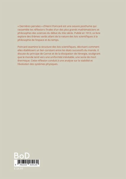 « Dernières pensées » d'Henri Poincaré est une oeuvre posthume qui rassemble les réflexions finales d'un des plus grands mathématiciens et philosophes des sciences du début du XXe siècle. Publié en 1913, ce livre explore des thèmes variés allant de la nature des lois scientifiques à la philosophie de l'espace et du temps. Poincaré examine la structure des lois scientifiques, décrivant comment elles établissent un lien constant entre les états successifs du monde. Il discute du principe de Carnot et de la dissipation de l'énergie, soulignant que le monde tend vers une uniformité inévitable, une…mehr