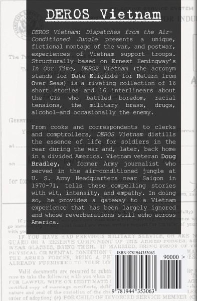 DEROS Vietnam: Dispatches from the Air-Conditioned Jungle presents a unique, fictional montage of the war, and postwar, experiences of Vietnam support troops. Structurally based on Ernest Hemingway's In Our Time, DEROS Vietnam (the acronym stands for Date Eligible for Return from Over Seas) is a riveting collection of 16 short stories and 16 interlinears about the GIs who battled boredom, racial tensions, the military brass, drugs, alcohol-and occasionally the enemy. From cooks and correspondents to clerks and comptrollers, DEROS Vietnam distills the essence of life for soldiers in the rear during the war and, later, back home in a divided America. Vietnam veteran Doug Bradley, a former Army journalist who served in the air-conditioned jungle at U. S. Army Headquarters near Saigon in 1970-71, tells these compelling stories with wit, intensity, and empathy. In doing so, he provides a gateway to a Vietnam experience that has been largely ignored and whose reverberations still echo across America.