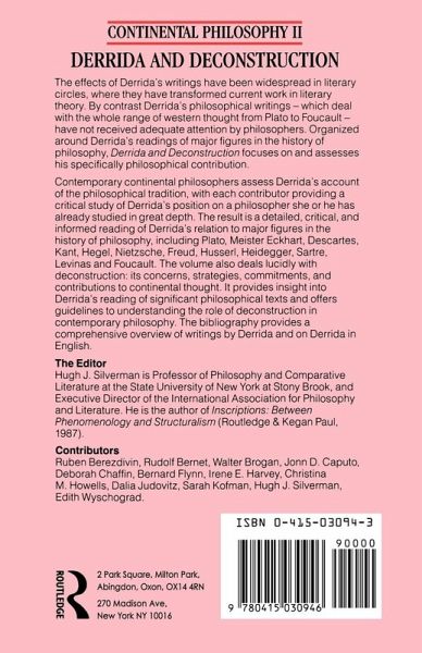 The effects of Derrida's writings have been widespread in literary circles, where they have transformed current work in literary theory. By contrast Derrida's philosophical writings--which deal with the whole range of western thought from Plato to Foucault--have not received adequate attention by philosophers. Organized around Derrida's readings of major figures in the history of philosophy, Derrida and Deconstruction focuses on and assesses his specifically philosophical contribution. Contemporary continental philosophers assess Derrida's account of philosophical tradition, with each contributor providing a critical study of Derrida's position on a philosopher she or he has already studied in depth These figures include Plato, Meister Eckhart, Descartes, Kant, Hegel, Nietzsche, Freud, Husserl, Heidegger, Sartre, and Foucault.