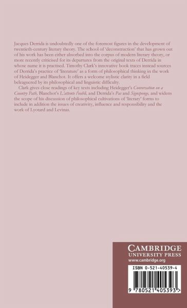 Jacques Derrida is undoubtedly one of the foremost figures in the development of twentieth-century literary theory. The school of 'deconstruction' that has grown out of his work has been either absorbed into the corpus of modern literary theory or, more recently, criticized for its departures from the original texts of Derrida in whose name it is practised. Timothy Clark's innovative book traces instead sources of Derrida's practice of 'literature' as a form of philosophical thinking in the work of Heidegger and Blanchot. It offers a welcome stylistic clarity in a field beleaguered by its philosophical and linguistic difficulty. Clark gives close readings of key texts including Heidegger's Conversation on a Country Path, Blanchot's L'attente l'oubli, and Derrida's Pas and Signsponge, and widens the scope of his discussion of philosophical cultivation of 'literary' forms to include in addition the issues of creativity, influence and responsibility as they appear in the work of Lyotard and Levinas.
