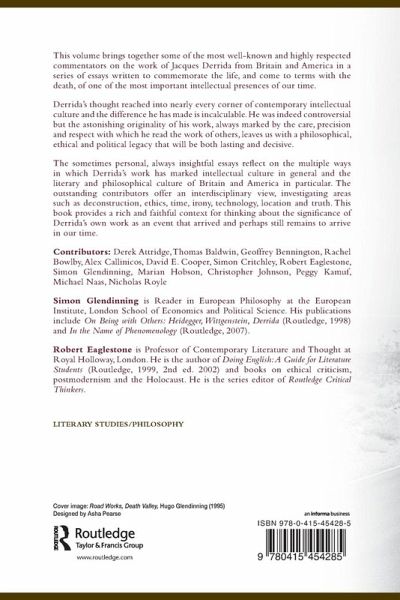 This volume brings together some of the most well-known and highly respected commentators on the work of Jacques Derrida from Britain and America in a series of essays written to commemorate the life and come to terms with the death of one of the most important intellectual presences of our time. Derrida's thought reached into nearly every corner of contemporary intellectual culture and the difference he has made is incalculable. He was indeed controversial but the astonishing originality of his work, always marked by the care, precision and respect with which he read the work of others, leaves us with a philosophical, ethical and political legacy that will be both lasting and decisive. The sometimes personal, always insightful essays reflect on the multiple ways in which Derrida's work has marked intellectual culture in general and the literary and philosophical culture of Britain and America in particular. The outstanding contributors offer an interdisciplinary view, investigating areas such as deconstruction, ethics, time, irony, technology, location and truth. This book provides a rich and faithful context for thinking about the significance of Derrida's own work as an event that arrived and perhaps still remains to arrive in our time. Contributors: Derek Attridge, Thomas Baldwin, Geoffrey Bennington, Rachel Bowlby, Alex Callinicos, David E. Cooper, Simon Critchley, Robert Eaglestone, Simon Glendinning, Marian Hobson, Christopher Johnson, Peggy Kamuf, Michael Naas, Nicholas Royle