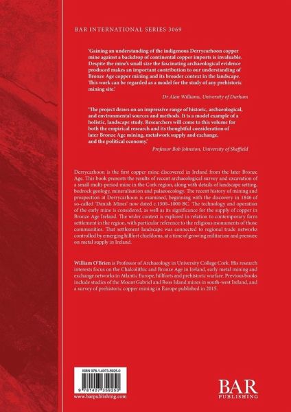 Derrycarhoon is the first copper mine discovered in Ireland from the later Bronze Age. This book presents the results of recent archaeological survey and excavation of a small multi-period mine in the Cork region, along with details of landscape setting, bedrock geology, mineralisation and palaeoecology. The recent history of mining and prospection at Derrycarhoon is examined, beginning with the discovery in 1846 of so-called 'Danish Mines' now dated c.1300-1000 BC. The technology and operation of the early mine is considered, as well as its significance for the supply of copper in Bronze Age Ireland. The wider context is explored in relation to contemporary farm settlement in the region, with particular reference to the religious monuments of those communities. That settlement landscape was connected to regional trade networks controlled by emerging hillfort chiefdoms, at a time of growing militarism and pressure on metal supply in Ireland.