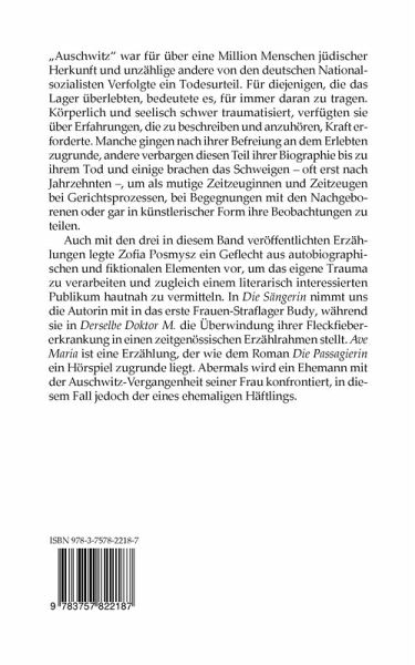 Auch mit den drei in diesem Band veröffentlichten Erzählungen legte Zofia Posmysz ein Geflecht aus autobiographischen und fiktionalen Elementen vor, um das eigene Trauma zu verarbeiten und zugleich einem literarisch interessierten Publikum hautnah zu vermitteln. In "Die Sängerin" nimmt uns die Autorin mit in das erste Frauen-Straflager Budy, während sie in "Derselbe Doktor M." die Überwindung ihrer Fleckfiebererkrankung in einen zeitgenössischen Erzählrahmen stellt. "Ave Maria" ist eine Erzählung, der wie dem Roman "Die Passagierin" ein Hörspiel zugrunde liegt. Abermals wird ein Ehemann mit der Auschwitz-Vergangenheit seiner Frau konfrontiert, in diesem Fall jedoch der eines ehemaligen Häftlings.