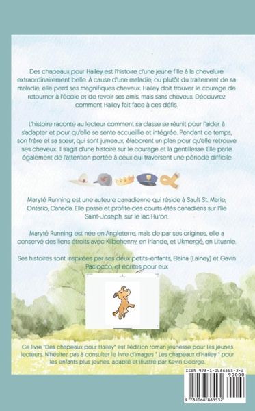 Des chapeaux pour Hailey Des chapeaux pour Hailey estl'historie d'une jeune fille à la chevelure extraordinairement belle. À cause d'une maladie, ou plutôt du traitment de sa maladie, elle perd ses magnifiques cheveux. Hailey doit trouver le courage de retourner à l'ecole et de revoir ses amis, mais sans cheveux. Découvrez comment Hailey fait face à ces défis. L'historie raconte au lecteur comment sa classe se réunit pour l'aider à s'adapter et pour qu'elle se sente accueillie et intégrée. Pendant ce temps, son frère et sa soeur, qui sont jumeaux, élaborent un plan pour qu'elle retrouve ses cheveux. Il s'agit d'une histoire sur le courage et la gentillesse. Elle parle également de l'attention portée à ceux qui traversent une période difficile.