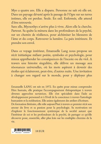 Myo a quatre ans. Elle a disparu. Personne ne sait où elle est. Dans un paysage dévasté après le passage de l'Ogre sur ses terres intimes, elle est perdue. Seule. En exil. Enfermée dans sa carapace, elle attend d'être retrouvée. Sans elle, Myosothys n'arrive plus à vivre. Alors elle la cherche. Partout. Sa quête la mènera dans les profondeurs de la psyché, sur un chemin de résilience, pour alchimiser les blessures de l'âme et du corps. Se reconstruire. Retrouver la lumière. La paix intérieure. Et prendre son envol.Dans ce voyage intérieur, Emanuelle Lang nous propose un récit initiatique mêlant poésie, symboles et psychologie, pour mieux appréhender les conséquences de l'inceste ou du viol. A travers une histoire singulière, elle délivre un message aux résonances universelles, où les mots aspirent à devenir des étoiles qui éclaireront, peut-être, d'autres nuits. Une invitation à changer son regard sur le monde, pour y déployer plus d'humanité...