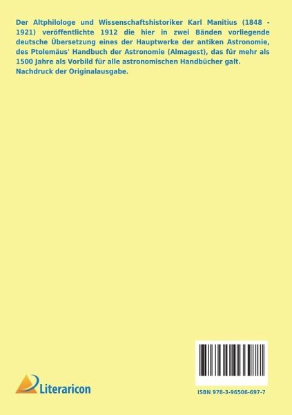 Der Altphilologe und Wissenschaftshistoriker Karl Manitius (1848 - 1921) veröffentlichte 1912 die hier in zwei Bänden vorliegende deutsche Übersetzung eines der Hauptwerke der antiken Astronomie, des Ptolemäus' Handbuch der Astronomie (Almagest), das für mehr als 1500 Jahre als Vorbild für alle astronomischen Handbücher galt. Nachdruck der Originalausgabe.