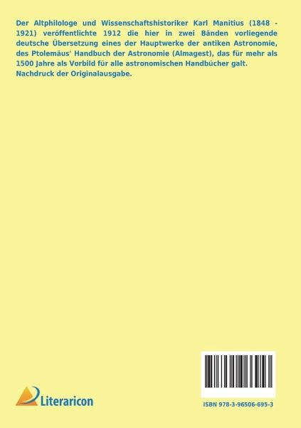 Der Altphilologe und Wissenschaftshistoriker Karl Manitius (1848 - 1921) veröffentlichte 1912 die hier in zwei Bänden vorliegende deutsche Übersetzung eines der Hauptwerke der antiken Astronomie, des Ptolemäus' Handbuch der Astronomie (Almagest), das für mehr als 1500 Jahre als Vorbild für alle astronomischen Handbücher galt. Nachdruck der Originalausgabe.