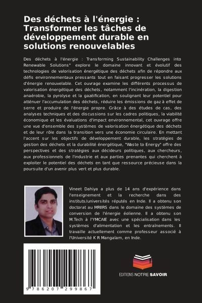 Des déchets à l'énergie : Transforming Sustainability Challenges into Renewable Solutions" explore le domaine innovant et évolutif des technologies de valorisation énergétique des déchets afin de répondre aux défis environnementaux pressants tout en faisant progresser les solutions d'énergie renouvelable. Cet ouvrage examine les différents processus de valorisation énergétique des déchets, notamment l'incinération, la digestion anaérobie, la pyrolyse et la gazéification, en soulignant leur potentiel pour atténuer l'accumulation des déchets, réduire les émissions de gaz à effet de serre et produire de l'énergie propre. Grâce à des études de cas, des analyses techniques et des discussions sur les cadres politiques, la viabilité économique et les évaluations d'impact environnemental, cet ouvrage offre une vue d'ensemble des systèmes de valorisation énergétique des déchets et de leur rôle dans la transition vers une économie circulaire. En mettant l'accent sur les objectifs de développement durable, les stratégies de gestion des déchets et la durabilité énergétique, "Waste to Energy" offre des perspectives et des stratégies aux décideurs politiques, aux chercheurs, aux professionnels de l'industrie et aux parties prenantes qui cherchent à exploiter le potentiel des déchets en tant que ressource précieuse dans la poursuite d'un avenir plus vert et plus durable.