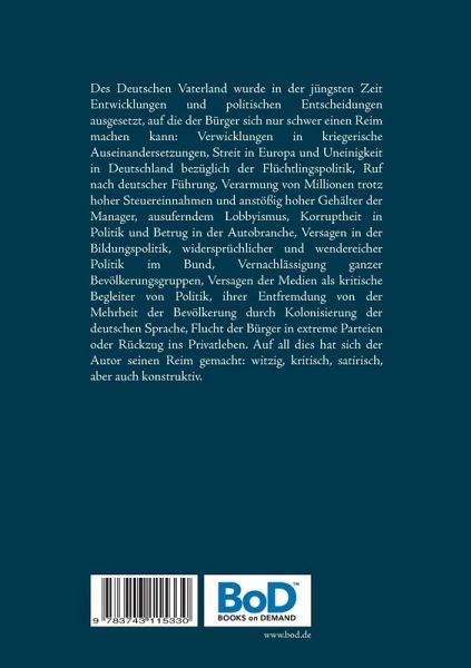 Des Deutschen Vaterland wurde in der jüngsten Zeit Entwicklungen und politischen Entscheidungen ausgesetzt, auf die der Bürger sich nur schwer einen Reim machen kann: Verwicklung in kriegerische Auseinandersetzungen, Streit in Europa und Uneinigkeit in Deutschland bezüglich der Flüchtlingspolitik, Ruf nach deutscher Führung, Verarmung von Millionen trotz hoher Steuereinnahmen und anstößig hoher Gehälter der Manager, ausufernder Lobbyismus, Korruptheit in Politik und Betrug in der Autobranche, Versagen in der Bildungspolitik, widersprüchliche und wendereiche Politik im Bund, Vernachlässigung ganzer Bevölkerungsgruppen, Versagen der Medien als kritische Begleiter von Politik, ihre Entfremdung von der Mehrheit der Bevölkerung durch Kolonisierung der deutschen Sprache, Flucht der Bürger in extreme Parteien oder Rückzug ins Privatleben. Auf all dies hat sich der Autor seinen Reim gemacht.