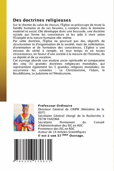 Sur le chemin du salut de chacun, l'Église se préoccupe de toute la famille humaine et de ses besoins, y compris dans le domaine matériel et social. Elle développe donc une boussole, une doctrine sociale qui forme les consciences et les aide à vivre selon l'Évangile et la nature humaine elle-même.Par cette doctrine, l'Église ne poursuit pas des objectifs de structuration ni d'organisation de la société, mais de sollicitation, d'orientation et de formation des consciences. L'Église a une mission de vérité à remplir, en tout temps et en toutes circonstances, en faveur d'une société à la mesure de l'homme, de sa dignité et de sa vocation.Cet ouvrage aborde une analyse socio-spirituelle et comparative des cinq (5) grandes doctrines religieuses mondiales, qui représentent également les 5 grandes religions mondiales, en occurrence les suivantes : Le Christianisme, l'Islam, le Bouddhisme, Le Judaïsme et l'Hindouisme.