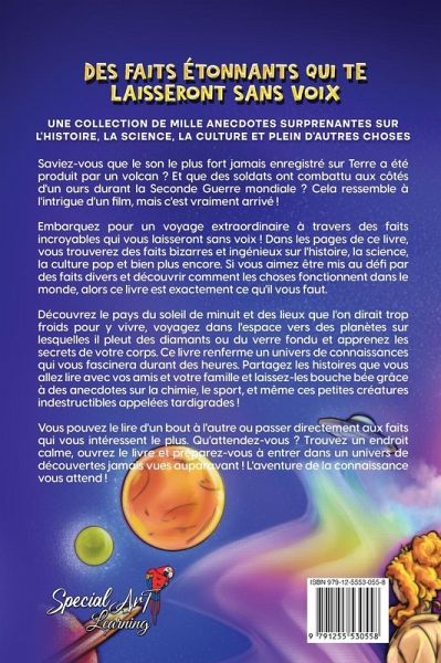 Embarquez pour un voyage extraordinaire à la découverte de nombreux faits incroyables qui vous laisseront sans voix ! Ce livre fascinant est rempli de faits étonnants sur la science, l'histoire, la culture pop et plus encore... Il est parfait pour les esprits curieux de tous les âges ! Explorez les faits sur la géographie, en découvrant les mystères des endroits les plus étranges et passionnants de notre planète, du pays du soleil de minuit à des lieux que vous penseriez trop froids pour y vivre. Voyagez dans l'espace, parmi des planètes sur lesquelles il pleut des diamants ou du verre fondu, apprenez les secrets de votre corps et les merveilles de la chimie. Ce livre sera votre porte d'entrée vers un univers de connaissances ! Partagez ces mini-histoires intéressantes avec vos amis et votre famille. Épatez-les en leur racontant de nombreux faits sportifs intrigants, en décrivant des comportements animaux bizarres et des inventions ingénieuses. Vous pouvez le lire d'un bout à l'autre, ou bien vous attarder sur les faits qui vous fascinent le plus... Des faits étonnants qui vous laisseront sans voix, vous emmèneront dans un voyage aventureux, plein de découvertes surprenantes. Ouvrez le livre et plongez dans un monde de faits incroyables conçus spécialement pour les esprits curieux !