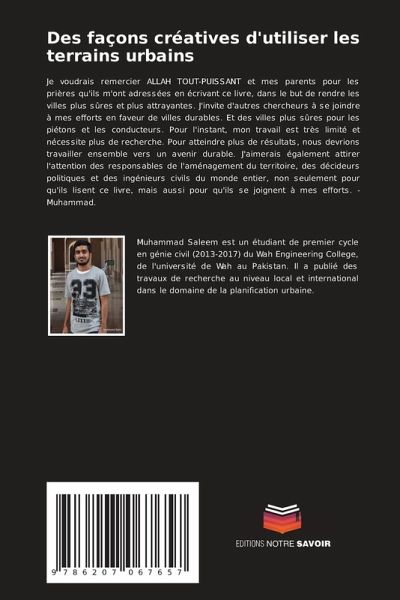 Je voudrais remercier ALLAH TOUT-PUISSANT et mes parents pour les prières qu'ils m'ont adressées en écrivant ce livre, dans le but de rendre les villes plus sûres et plus attrayantes. J'invite d'autres chercheurs à se joindre à mes efforts en faveur de villes durables. Et des villes plus sûres pour les piétons et les conducteurs. Pour l'instant, mon travail est très limité et nécessite plus de recherche. Pour atteindre plus de résultats, nous devrions travailler ensemble vers un avenir durable. J'aimerais également attirer l'attention des responsables de l'aménagement du territoire, des décideurs politiques et des ingénieurs civils du monde entier, non seulement pour qu'ils lisent ce livre, mais aussi pour qu'ils se joignent à mes efforts. -Muhammad.