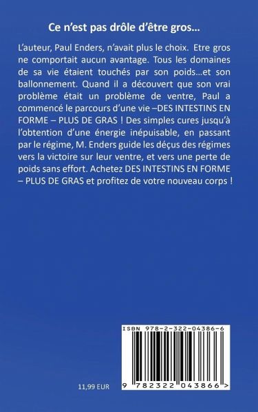 Ce n'est pas drôle d'être gros...L'auteur, Paul Enders, n'avait plus le choix. Etre gros ne comportait aucun avantage. Tous les domaines de sa vie étaient touchés par son poids...et son ballonnement. Quand il a découvert que son vrai problème était un problème de ventre, Paul a commencé le parcours d'une vie - DES INTESTINS EN FORME - PLUS DE GRAS ! Des simples cures jusqu'à l'obtention d'une énergie inépuisable, en passant par le régime, M. Enders guide les déçus des régimes vers la victoire sur leur ventre, et vers une perte de poids sans effort. Achetez DES INTESTINS EN FORME - PLUS DE GRAS et profitez de votre nouveau corps !