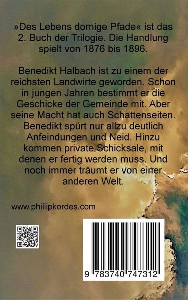 »Des Lebens dornige Pfade« ist das 2. Buch der Trilogie. Die Handlung spielt von 1876 bis 1896.Benedikt Halbach ist zu einem der reichsten Landwirte geworden. Schon in jungen Jahren bestimmt er die Geschicke der Gemeinde mit. Aber seine Macht hat auch Schattenseiten. Benedikt spürt nur allzu deutlich Anfeindungen und Neid. Hinzu kommen private Schicksale, mit denen er fertig werden muss. Und noch immer träumt er von einer anderen Welt.