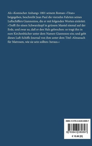 Als "Komischer Anhang" 1801 seinem Roman "Titan" beigegeben, beschreibt Jean Paul die vierzehn Fahrten seines Luftschiffers Giannozzos, die er mit folgenden Worten einleitet: "Trefft ihr einen Schwarzkopf in grünem Mantel einmal auf der Erde, und zwar so, daß er den Hals gebrochen: so tragt ihn in eure Kirchenbücher unter dem Namen Giannozzo ein; und gebt dieses Luft-Schiffs-Journal von ihm unter dem Titel 'Almanach für Matrosen, wie sie sein sollten' heraus."