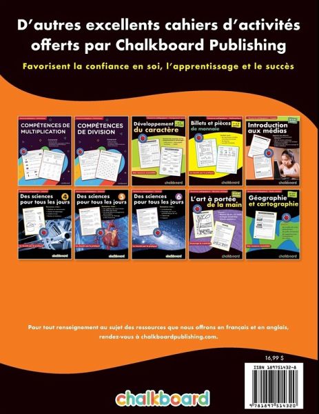 Des Mathematiques Pour Tous Les Jours 5: Reinforce essential math concepts and skills with consistent and focused practice! This resource features 30 weeks of activities where each day of the week (Monday to Friday) focuses on a specific math strand featuring: Number Sense Patterning and Algebra Measurement Geometry and Spatial Sense Data Management and Probability Brain Stretch This versatile resource is the ideal supplement to enhance or enrich any math curriculum. Use these activities as individual bell work, as a whole class or as assigned homework. It also includes a student tracking sheet as well as teaching tips. To easily differentiate instruction, the student pages for the other grades in this series are intentionally organized in the same way and look similar.