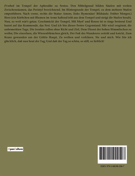 (Vorhof im Tempel der Aphrodite zu Sestos. Den Mittelgrund bilden Säulen mit weiten Zwischenräumen, das Peristyl bezeichnend. Im Hintergrunde der Tempel, zu dem mehrere Stufen emporführen. Nach vorne, rechts die Statue Amors, links Hymenäus' Bildsäule. Früher Morgen.) Hero (ein Körbchen mit Blumen im Arme haltend tritt aus dem Tempel und steigt die Stufen herab). Nun, so weit wär's getan. Geschmückt der Tempel, Mit Myrt' und Rosen ist er rings bestreut Und harret auf das Kommende, das Fest. Und ich bin dieses Festes Gegenstand. Mir wird vergönnt, die unbemerkten Tage, Die fernhin rollen ohne Richt und Ziel, Dem Dienst der hohen Himmlischen zu weihn; Die einzelnen, die Wiesenblümchen gleich, Der Fuß des Wanderers zertritt und knickt, Zum Kranz gewunden um der Göttin Haupt, Zu weihen und verklären. Sie und mich. Wie bin ich glücklich, daß nun heut der Tag; Und daß der Tag so schön, so still, so lieblich!