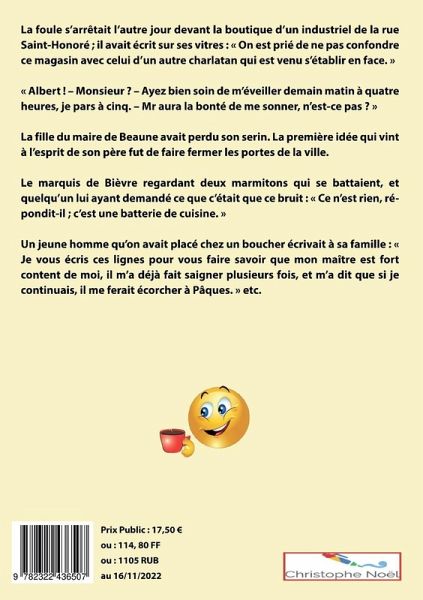 Recueil d'anecdotes surprenantes et insolites, de citations, de naïvetés, gasconnades, bouffonneries, calembours, réparties, plaisanteries et autres bons mots, compilés par Hilaire le Gai, et sélectionnés par Ch. Noël, pour passer d'agréables moments.Cet ouvrage se situe dans la suite des recueils dont Nasr Eddin Hodja/Djeha et le héros, mais aussi du Pogge, d'Arlotto, de Bonaventure des Périers, du Sieur d'Ouville, de Philippe d'Alcripe, de Louis Garon, de Louis Loire et Louis Thomas (voir liste des parus, pages 5 et 5 du livre).