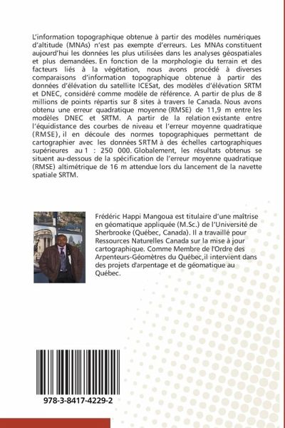 L'information topographique obtenue à partir des modèles numériques d'altitude (MNAs) n'est pas exempte d'erreurs. Les MNAs constituent aujourd'hui les données les plus utilisées dans les analyses géospatiales et plus demandées. En fonction de la morphologie du terrain et des facteurs liés à la végétation, nous avons procédé à diverses comparaisons d'information topographique obtenue à partir des données d'élévation du satellite ICESat, des modèles d'élévation SRTM et DNEC, considéré comme modèle de référence. A partir de plus de 8 millions de points répartis sur 8 sites à travers le Canada. Nous avons obtenu une erreur quadratique moyenne (RMSE) de 11,9 m entre les modèles DNEC et SRTM. A partir de la relation existante entre l'équidistance des courbes de niveau et l'erreur moyenne quadratique (RMSE), il en découle des normes topographiques permettant de cartographier avec les données SRTM à des échelles cartographiques supérieures au 1 : 250 000. Globalement, les résultats obtenus se situent au-dessous de la spécification de l'erreur moyenne quadratique (RMSE) altimétrique de 16 m attendue lors du lancement de la navette spatiale SRTM.