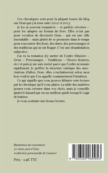 Ces chroniques sont pour la plupart issues du blog sur Oran que j'ai tenu entre 2012 et 2013.Je les ai souvent remaniées - et parfois réécrites - pour les adapter au format du livre. Elles n'ont pas pour vocation de découvrir Oran - qui est une ville insondable - mais plutôt de se promener dans le temps pour rencontrer des lieux, des dates, des personnages et des traditions qui m'ont frappé.C'est une déambulation subjective.