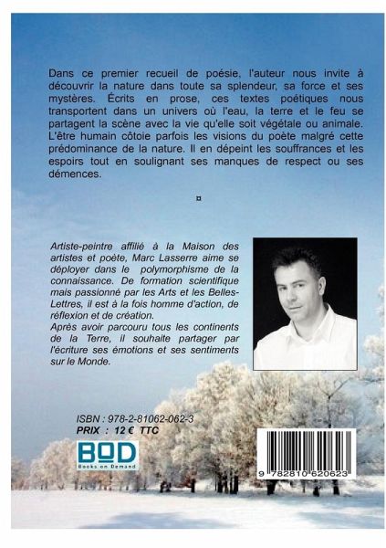 Dans ce premier recueil de poésie, l'auteur nous invite à découvrir la nature dans toute sa splendeur, sa force et ses mystères. Écrits en prose, ces textes poétiques nous transportent dans un univers où l'eau, la terre et le feu se partagent la scène avec la vie qu'elle soit végétale ou animale. L'être humain côtoie parfois les visions du poète malgré cette prédominance de la nature. Il en dépeint les souffrances et les espoirs tout en soulignant ses manques de respect ou ses démences.