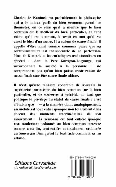 Charles de Koninck est probablement le philosophe qui a le mieux parlé du bien commun parmi les thomistes, en ce sens qu'il a montré que le bien commun est le meilleur du bien particulier, en tant même qu'il est commun, à savoir en tant qu'il est aussi le bien d'un autre. Il a raison de cause finale, il appelle d'être aimé comme commun parce que sa communicabilité est indissociable de sa perfection. Mais de Koninck et les catholiques traditionalistes en général ¿ dont le Père Garrigou-Lagrange, qui subordonnait la société à la personne ¿ ne comprennent pas qu'un bien puisse avoir raison de cause finale sans être cause finale ultime. Il n'est qu'une manière cohérente de soutenir la supériorité intrinsèque du bien commun sur le bien particulier, et de conserver à celui-là, en tant que politique le privilège du statut de cause finale ; c'est d'établir que ¿ à la manière dont, analogiquement, un mobile est tout entier quoique non totalement dans chacun des moments intermédiaires de son mouvement ¿ la personne est tout entière quoique non totalement ordonnée au bien commun terrestre comme à sa fin, tout entière et totalement ordonnée au Souverain Bien qu'est la béatitude comme à sa fin ultime. Ce fascicule est un tiré à part de l'Annexe du livre Doctrine du Fascisme Catholique, en abrégé.