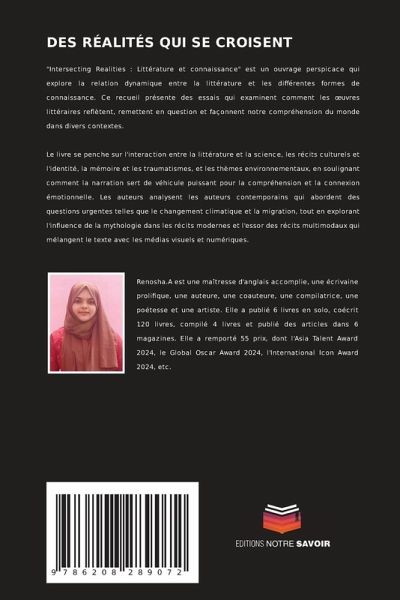 "Intersecting Realities : Littérature et connaissance" est un ouvrage perspicace qui explore la relation dynamique entre la littérature et les différentes formes de connaissance. Ce recueil présente des essais qui examinent comment les oeuvres littéraires reflètent, remettent en question et façonnent notre compréhension du monde dans divers contextes.Le livre se penche sur l'interaction entre la littérature et la science, les récits culturels et l'identité, la mémoire et les traumatismes, et les thèmes environnementaux, en soulignant comment la narration sert de véhicule puissant pour la compréhension et la connexion émotionnelle. Les auteurs analysent les auteurs contemporains qui abordent des questions urgentes telles que le changement climatique et la migration, tout en explorant l'influence de la mythologie dans les récits modernes et l'essor des récits multimodaux qui mélangent le texte avec les médias visuels et numériques.