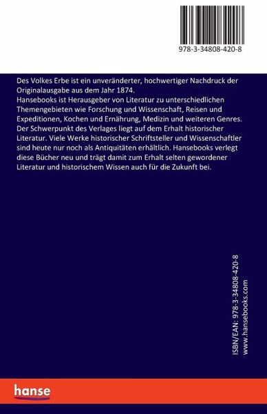 Des Volkes Erbe ist ein unveränderter, hochwertiger Nachdruck der Originalausgabe aus dem Jahr 1874.Hansebooks ist Herausgeber von Literatur zu unterschiedlichen Themengebieten wie Forschung und Wissenschaft, Reisen und Expeditionen, Kochen und Ernährung, Medizin und weiteren Genres. Der Schwerpunkt des Verlages liegt auf dem Erhalt historischer Literatur. Viele Werke historischer Schriftsteller und Wissenschaftler sind heute nur noch als Antiquitäten erhältlich. Hansebooks verlegt diese Bücher neu und trägt damit zum Erhalt selten gewordener Literatur und historischem Wissen auch für die Zukunft bei.