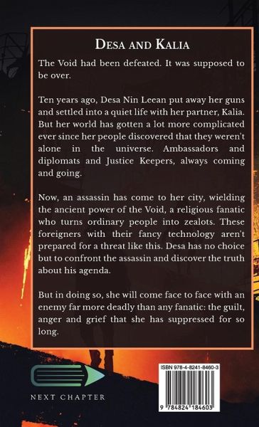 The Void had been defeated. It was supposed to be over. Ten years ago, Desa Nin Leean put away her guns and settled into a quiet life with her partner, Kalia. But her world has gotten a lot more complicated ever since her people discovered that they weren't alone in the universe. Ambassadors and diplomats and Justice Keepers, always coming and going. Now, an assassin has come to her city, wielding the ancient power of the Void, a religious fanatic who turns ordinary people into zealots. These foreigners with their fancy technology aren't prepared for a threat like this. Desa has no choice but to confront the assassin and discover the truth about his agenda. But in doing so, she will come face to face with an enemy far more deadly than any fanatic: the guilt, anger and grief that she has suppressed for so long.