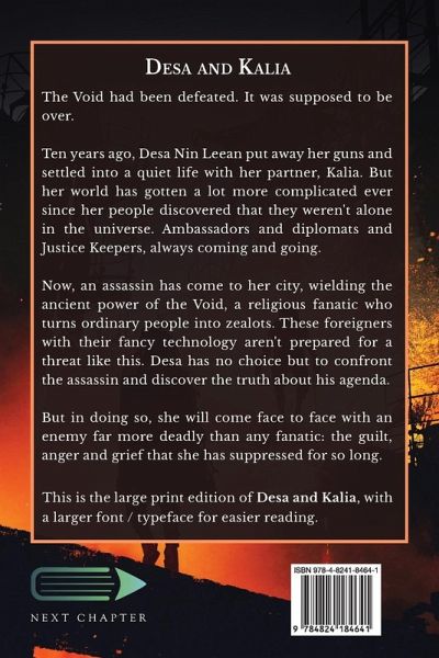 The Void had been defeated. It was supposed to be over. Ten years ago, Desa Nin Leean put away her guns and settled into a quiet life with her partner, Kalia. But her world has gotten a lot more complicated ever since her people discovered that they weren't alone in the universe. Ambassadors and diplomats and Justice Keepers, always coming and going. Now, an assassin has come to her city, wielding the ancient power of the Void, a religious fanatic who turns ordinary people into zealots. These foreigners with their fancy technology aren't prepared for a threat like this. Desa has no choice but to confront the assassin and discover the truth about his agenda. But in doing so, she will come face to face with an enemy far more deadly than any fanatic: the guilt, anger and grief that she has suppressed for so long. This is the large print edition of Desa and Kalia, with a larger font / typeface for easier reading.