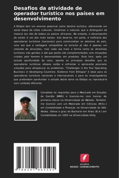 A Etiópia tem um enorme potencial como destino turístico, oferecendo um vasto leque de sítios culturais, históricos e naturais que o distinguem da maioria (se não de todos) os países africanos. No entanto, o desempenho do sector é um dos mais baixos. Isto deve-se, em parte, à ineficácia dos operadores turísticos (nacionais) para comercializar os destinos do país, uma vez que a vantagem competitiva no turismo já não é apenas um conjunto de atracções, mas cada vez mais a forma como os atractivos turísticos são geridos e até que ponto são complementados com inovações criadas pelo homem e desenvolvidos em produtos. Este livro, após um estudo aprofundado do caso, aponta os principais desafios que os operadores turísticos etíopes estão a enfrentar e apresenta possíveis soluções para ultrapassar os problemas. "Challenges in the Tour Operating Business in Developing Countries: Evidence from Ethiopia" é ideal para os operadores turísticos nacionais e internacionais e para os investigadores que pretendam aprofundar o estudo deste tema na Etiópia ou reproduzi-lo num contexto diferente.