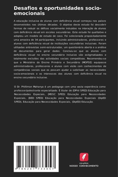 A educação inclusiva de alunos com deficiência visual começou nos países desenvolvidos nas últimas décadas. O objetivo deste estudo foi descobrir formas de reduzir os défices socialmente induzidos na interação de alunos com deficiência visual em escolas secundárias. Este estudo foi qualitativo e adoptou um modelo de estudo de caso. Foi selecionada propositadamente uma amostra de 34 participantes, incluindo administradores, professores e alunos com deficiência visual de instituições secundárias inclusivas. Foram utilizadas entrevistas semi-estruturadas, um questionário aberto e a análise de documentos para gerar dados. Concluiu-se que os alunos com deficiência visual no ensino secundário inclusivo são estigmatizados e totalmente excluídos das actividades sociais competitivas. Recomendou-se que o Ministério do Ensino Primário e Secundário (MOPSE) equipasse administradores, professores e alunos com visão com conhecimentos de competências sociais que os possam ajudar a satisfazer as necessidades socio-emocionais e os interesses dos alunos com deficiência visual no ensino secundário inclusivo.
