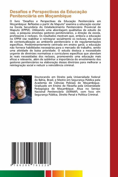 O livro "Desafios e Perspectivas da Educação Penitenciária em Moçambique: Reflexões a partir de Maputo" examina a educação escolar na Escola Secundária do Estabelecimento Penitenciário Provincial de Maputo (EPPM). Utilizando uma abordagem qualitativa de estudo de caso, a pesquisa envolveu gestores penitenciários, a direção da escola, professores e reclusos. Os resultados mostram que, embora a educação no EPPM vise reabilitar e reintegrar socialmente os reclusos, ela carece de contextualização ao ambiente penitenciário e de regulamentações específicas. Predominantemente centrada em ensino geral, a educação não fornece habilidades necessárias para o mercado de trabalho, sendo uma atividade de baixa prioridade. O estudo destaca a necessidade urgente de diretrizes normativas e curriculares específicas que atendam às reais necessidades dos reclusos, promovendo uma educação mais eficaz e relevante, além de sublinhar a importância do envolvimento dos gestores penitenciários na elaboração dessas diretrizes para melhorar a reintegração social e reduzir a reincidência criminal.