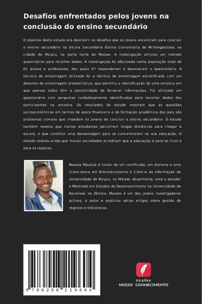 O objetivo deste estudo era descobrir os desafios que os jovens encontram para concluir o ensino secundário na Escola Secundária Diurna Comunitária de Mchengautuba, na cidade de Mzuzu, na parte norte do Malawi. A investigação utilizou um método quantitativo para recolher dados. A investigação foi efectuada numa população total de 61 alunos e professores, dos quais 57 responderam e devolveram o questionário. A técnica de amostragem utilizada foi a técnica de amostragem estratificada com um desenho de amostragem probabilística, que permitiu a identificação de uma amostra em que apenas todos têm a possibilidade de fornecer informações. Foi utilizado um questionário com perguntas cuidadosamente identificadas para recolher dados dos participantes na amostra. Os resultados do estudo mostram que as questões socioeconómicas em termos de apoio financeiro e de formação académica dos pais são problemas comuns que impedem os jovens de concluir o ensino secundário. O estudo também revelou que muitos estudantes percorrem longas distâncias para chegar à escola, o que constitui uma desvantagem para se concentrarem na sua educação. O estudo revelou ainda que muitas sociedades acreditam que a educação é para os ricos e para os rapazes.