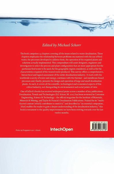 The book comprises 14 chapters covering all the issues related to water desalination. These chapters emphasize the relationship between problems encountered with the use of feed water, the processes developed to address them, the operation of the required plants and solutions actually implemented. This compendium will assist designers, engineers and investigators to select the process and plant configuration that are most appropriate for the particular feed water to be used, for the geographic region considered, as well as for the characteristics required of the treated water produced. This survey offers a comprehensive, hierarchical and logical assessment of the entire desalination industry. It starts with the worldwide scarcity of water and energy, continues with the thermal - and membrane-based processes and, finally, presents the design and operation of large and small desalination plants. As such, it covers all the scientific, technological and economical aspects of this critical industry, not disregarding its environmental and social points of view. One of InTech's books has received widespread praise across a number of key publications. Desalination, Trends and Technologies (Ed. Schorr, M. 2011) has been reviewed in Corrosion Engineering, Science