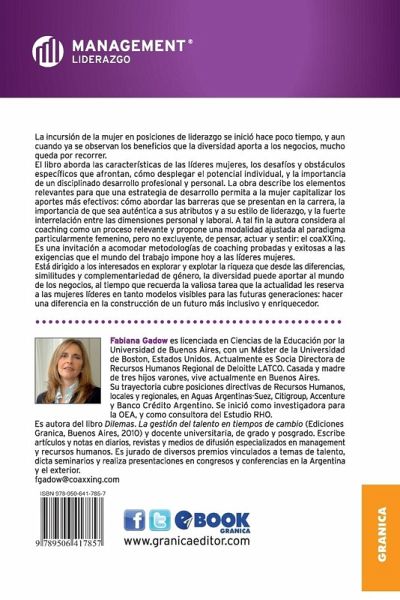 La incursión de la mujer en posiciones de liderazgo se inició hace poco tiempo, y aún cuando ya se observan los beneficios que la diversidad aporta a los negocios, mucho queda por recorrer. El libro aborda las características de las líderes mujeres, los desafíos y obstáculos específicos que afrontan, como desplegar el potencial individual, y la importancia de un disciplinado desarrollo profesional y personal. La obra describe los elementos relevantes para que una estrategia de desarrollo permita a la mujer capitalizar los aportes mas efectivos: como abordar las barreras que se presentan en la carrera, la importancia de que sea auténtica a sus atributos, y a su estilo de liderazgo, y la fuerte interrelacion entre las dimensiones personal y laboral. A tal fin la autora considera al coaching como un proceso relevante y propone una modalidad ajustada al paradigma particularmente femenino, pero no excluyente, de pensar, actuar y sentir: el coaxxing. Es una invitación a acomodar metodologías de coaching probadas y exitosas a las exigencias que el mundo del trabajo impone hoy a las líderes mujeres. Está dirigido a los interesados en explorar y explotar la riqueza que desde las diferencias, similitudes y complementariedad de género, la diversidad puede aportar al mundo de los negocios, al tiempo que recuerda la valiosa tarea que la actualidad les reserva a las mujeres líderes en tanto modelos visibles para las futuras generaciones: hacer una diferencia en la construcción de un futuro más inclusivo y enriquecedor.