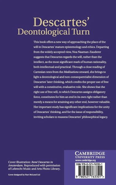 This book offers a way of approaching the place of the will in Descartes' mature epistemology and ethics. Departing from the widely accepted view, Noa Naaman-Zauderer suggests that Descartes regards the will, rather than the intellect, as the most significant mark of human rationality, both intellectual and practical. Through a close reading of Cartesian texts from the Meditations onward, she brings to light a deontological and non-consequentialist dimension of Descartes' later thinking, which credits the proper use of free will with a constitutive, evaluative role. She shows that the right use of free will, to which Descartes assigns obligatory force, constitutes for him an end in its own right rather than merely a means for attaining any other end, however valuable. Her important study has significant implications for the unity of Descartes' thinking, and for the issue of responsibility, inviting scholars to reassess Descartes' philosophical legacy.
