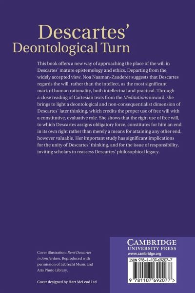 This book offers a way of approaching the place of the will in Descartes' mature epistemology and ethics. Departing from the widely accepted view, Noa Naaman-Zauderer suggests that Descartes regards the will, rather than the intellect, as the most significant mark of human rationality, both intellectual and practical. Through a close reading of Cartesian texts from the Meditations onward, she brings to light a deontological and non-consequentialist dimension of Descartes' later thinking, which credits the proper use of free will with a constitutive, evaluative role. She shows that the right use of free will, to which Descartes assigns obligatory force, constitutes for him an end in its own right rather than merely a means for attaining any other end, however valuable. Her important study has significant implications for the unity of Descartes' thinking, and for the issue of responsibility, inviting scholars to reassess Descartes' philosophical legacy.
