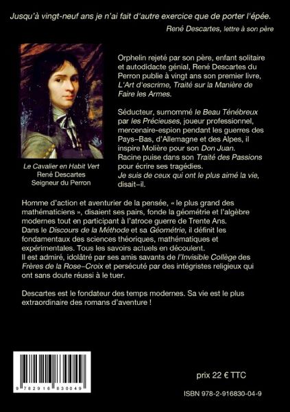 Orphelin rejeté par son père, enfant solitaire et autodidacte génial, René Descartes du Perron publie à vingt ans son premier livre, L'Art d'escrime, Traité sur la Manière de Faire les Armes. Séducteur, surnommé le Beaux Ténébreux par les Précieuses, joueur professionnel, mercenaire-espion pendant les guerres des Pays-Bas, d'Allemagne et des Alpes, il inspire Molière pour son Don Juan. Racine puise dans son Traité des Passions pour écrire ses tragédies. Je suis de ceux qui ont le plus aimé la vie, dit-il. Homme d'action et aventurier de la pensée, il énonce les bases de la géométrie et de l'algèbre modernes tout en participant à l'atroce guerre de Trente Ans. Dans le Discours de la Méthode et sa Géométrie, "le plus grand des mathématiciens", disait ses pairs, définit les fondamentaux des sciences théoriques, mathématiques et expérimentales. Tous les savoirs actuels en découlent. Il est admiré, idolâtré par ses amis savants de l'Invisible Collège des Frères de la Rose-Croix et persécuté par les intégristes religieux qui ont sans doute réussi à le tuer. Descartes est le fondateur des temps modernes. Sa vie est le plus extraordinaire des romans d'aventure.