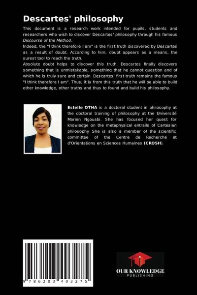 This document is a research work intended for pupils, students and researchers who wish to discover Descartes' philosophy through his famous Discourse of the Method. Indeed, the "I think therefore I am" is the first truth discovered by Descartes as a result of doubt. According to him, doubt appears as a means, the surest tool to reach the truth. Absolute doubt helps to discover this truth. Descartes finally discovers something that is unmistakable, something that he cannot question and of which he is truly sure and certain. Descartes' first truth remains the famous "I think therefore I am". Thus, it is from this truth that he will be able to build other knowledge, other truths and thus to found and build his philosophy.