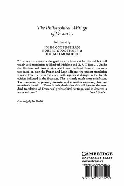 Based on the new and much acclaimed two-volume Cambridge edition of The Philosophical Writings of Descartes, this anthology contains the most important and widely studied of those writings, including the Discourse and Meditations and substantial extracts from the Regulae, Optics, Principles, Objectives and Replies, Comments on a Broadsheet, and Passions of the Soul.