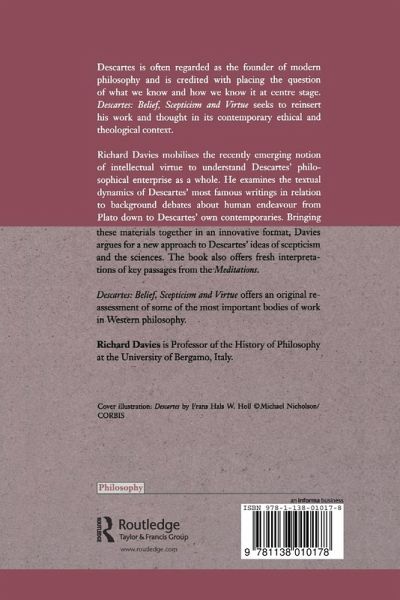 Descartes is often regarded as the founder of modern philosophy, and is credited with placing at centre stage the question of what we know and how we know it. Descartes: Belief, Scepticism and Virtue seeks to reinsert his work and thought in its contemporary ethical and theological context. Richard Davies explores the much neglected notion of intellectual virtue as it applies to Descartes' inquiry as a whole. He examines the textual dynamics of Descartes' most famous writings in relation to background debates about human endeavour from Plato down to Descartes' own contemporaries. Bringing these materials together in a novel format, Davies argues for a new approach to Descartes' ideas of scepticism and the sciences. The book also offers fresh interpretations of key passages of the Meditations . Descartes: Belief, Scepticism and Virtue offers an original reassessment of some of the most important bodies of work in Western Philosophy.