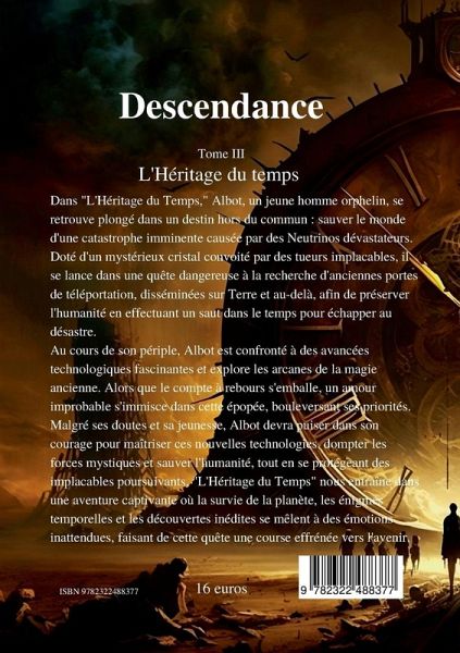 Dans "L'Héritage du Temps," Albot, un jeune homme orphelin, se retrouve plongé dans un destin hors du commun : sauver le monde d'une catastrophe imminente causée par des Neutrinos dévastateurs. Doté d'un mystérieux cristal convoité par des tueurs implacables, il se lance dans une quête dangereuse à la recherche d'anciennes portes de téléportation, disséminées sur Terre et au-delà, afin de préserver l'humanité en effectuant un saut dans le temps pour échapper au désastre.Au cours de son périple, Albot est confronté à des avancées technologiques fascinantes et explore les arcanes de la magie ancienne. Alors que le compte à rebours s'emballe, un amour improbable s'immisce dans cette épopée, bouleversant ses priorités.Malgré ses doutes et sa jeunesse, Albot devra puiser dans son courage pour maîtriser ces nouvelles technologies, dompter les forces mystiques et sauver l'humanité, tout en se protégeant des implacables poursuivants. "L'Héritage du Temps" nous entraîne dans une aventure captivante où la survie de la planète, les énigmes temporelles et les découvertes inédites se mêlent à des émotions inattendues, faisant de cette quête une course effrénée vers l'avenir.