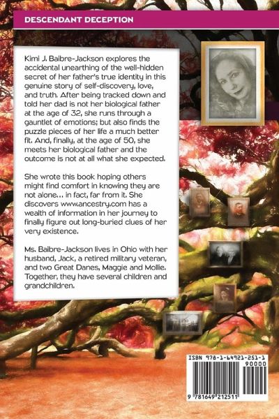 Inheritance can be tricky. Families can lie. In the new book Descendant Deception, Kimi J. Baibre-Jackson explores the accidental unearthing of the well-hidden secret of her father's true identity in this genuine story of self-discovery, love, and truth. After being told her dad is not her biological father at the age of 32, she runs through a gauntlet of emotions; but also finds the puzzle pieces of her life a much better fit. And, finally, at the age of 50, she meets her biological father and the outcome is not at all what she expected. What if your father is not your father? Long before DNA tests could reveal shocking information, Kimi J. Baibre-Jackson was tracked down by a long lost relative, one she never knew she had. In Descendant Deception, the chronicle of one woman's journey to uncover her true family tree takes unexpected twists and turns...and culminates in a surprise ending no one sees coming. Who's Your Daddy? This phrase often conjures up laughter. It is seen as a joke. The dictionary defines it as a slang expression that, in one use, takes the form of a rhetorical question. It can be described as a video game, a term to describe sexual dominance, or a song lyric...Paternity Fraud is often described as the intentional decision to keep the identity of the biological father from him and/or the man who ultimately raises the child. But what of the child? What is it called when the father(s) know, but the child does not? Descendant Deception is used to describe betrayal of the child in such situations. So-called because if the truth is never exposed, generations of people will unknowingly believe they come from an ancestor of which they did not. This book explores the decision made when the author was a baby to keep the identity of her biological father private, not from him, but from me. You will read how the seemingly simple decision, or little white lie, changed the trajectory of life forever.