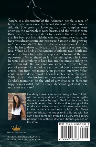 Sorcha is a descendant of the Atlantean people, a race of humans who were once the blood slaves of the vampires of Atlantis. She grew up knowing that the vampires were enemies, the werewolves were beasts, and the witches were their friends. When she starts to question the situation her clan has been put into with the witches, a vampire who haunts her erotic dreams comes to the rescue. Samson didn't grow up in Atlantis and didn't choose to become a vampire. He hates what he has to do to survive, and can't imagine ever deserving love. When he finds a Descendant of Atlantis near death and nurses her back to health, he expects her to run at the first opportunity. When she offers him her willing body, he knows he would do anything to keep her, and that means hiding his monstrous side. But you can't love someone if you're hiding part of yourself. One look at Samson and Sorcha knows she erased him from her memory on purpose, but why? What could he have done to make her risk such a dangerous spell? With battle on the horizon and Descendants in trouble, will Sorcha's memories be the end of any chance at Samson's happiness, or will it lead to a new understanding of what these monsters really are?