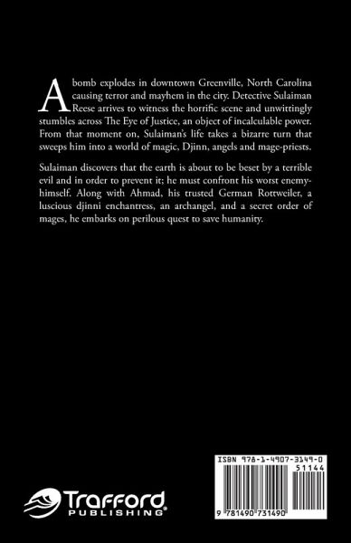 A bomb explodes in downtown Greenville, North Carolina causing terror and mayhem in the city. Detective Sulaiman Reese arrives to witness the horrific scene and unwittingly stumbles across The Eye of Justice, an object of incalculable power. From that moment on, Sulaiman's life takes a bizarre turn that sweeps him into a world of magic, Djinn, angels and mage-priests. Sulaiman discovers that the earth is about to be beset by a terrible evil and in order to prevent it; he must confront his worst enemy-himself. Along with Ahmad, his trusted German Rottweiler, a luscious djinni enchantress, an archangel, and a secret order of mages, he embarks on perilous quest to save humanity.