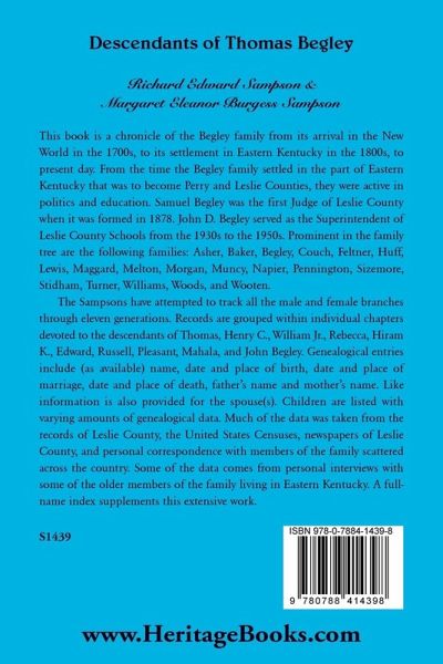 The Sampsons have attempted to track all the male and female branches through 11 generations to the present day. Records are grouped within individual chapters devoted to the descendants of Thomas, Henry C., William Jr., Rebecca, Hiram K., Edward, Russell, Pleasant, Mahala, and John Begley.