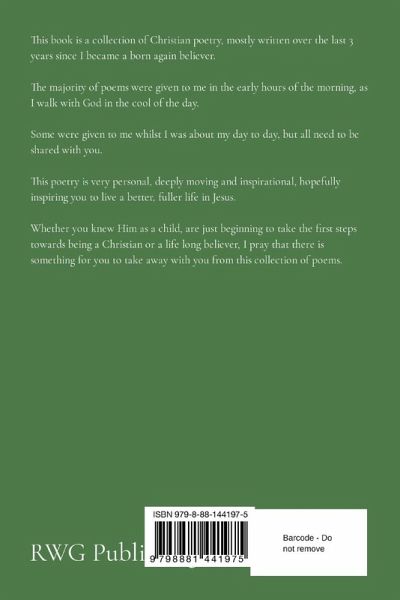 This book is a collection of Christian poetry, mostly written over the last 3 years since I became a born again believer. The majority of poems were given to me in the early hours of the morning, as I walk with God in the cool of the day. Some were given to me whilst I was about my day to day, but all need to be shared with you. This poetry is very personal, deeply moving and inspirational, hopefully inspiring you to live a better, fuller life in Jesus. Whether you knew Him as a child, are just beginning to take the first steps towards being a Christian or a life long believer, I pray that there is something for you to take away with you from this collection of poems.